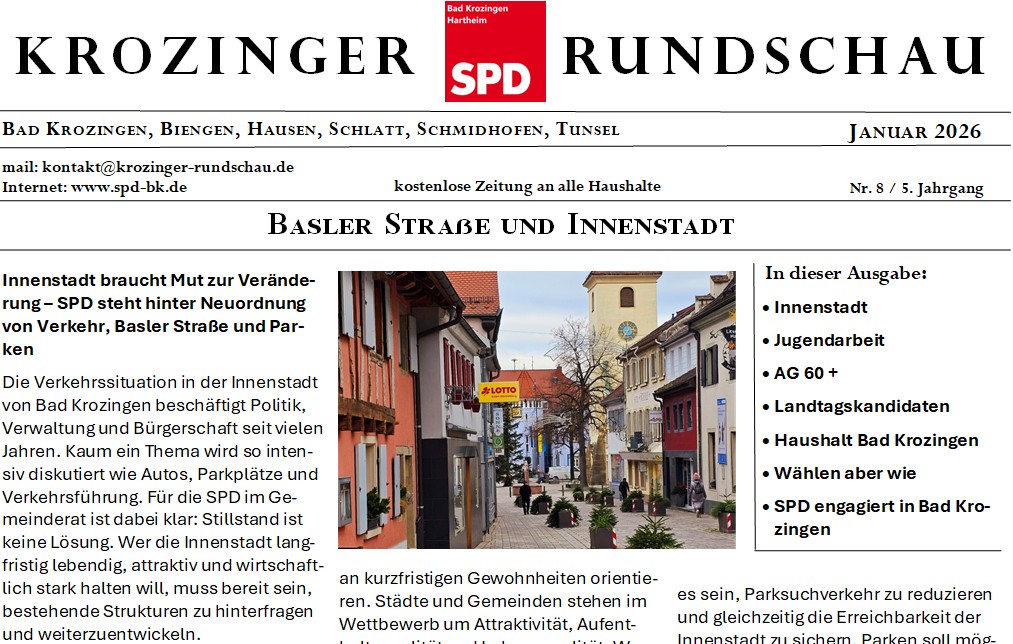 Die Krozinger Rundschau ist eine kostenlose Zeitung des SPD Ortsvereins, die in unregelmäßigen Abständen kostenlos an alle Haushalte verteilt wird. Die Krozinger Rundschau ist keine tagesaktuelle Zeitung und kann es auch nicht sein, da sie von unserem Redaktionsteam mit viel Herblut und einigem zeitlichen Vorlauf in der Freizeit erstellt wird.