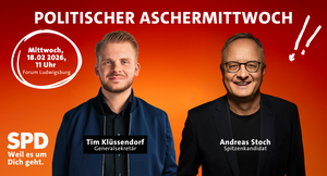 Wir laden euch herzlich zu unserem traditionellen Politischen Aschermittwochein ein. Dieser findet am 18. Februar 2026 im Forum am Schlosspark in Ludwigsburg statt. Wir freuen uns sehr, dass unser Generalsekretär der SPD Tim Klüssendorf uns in Ludwigsburg besucht!